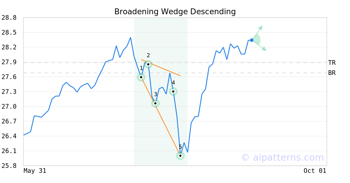 The Broadening Wedge Descending pattern forms when the price of a security makes lower lows (1, 3, 5) and lower highs (2, 4), forming a downtrend.