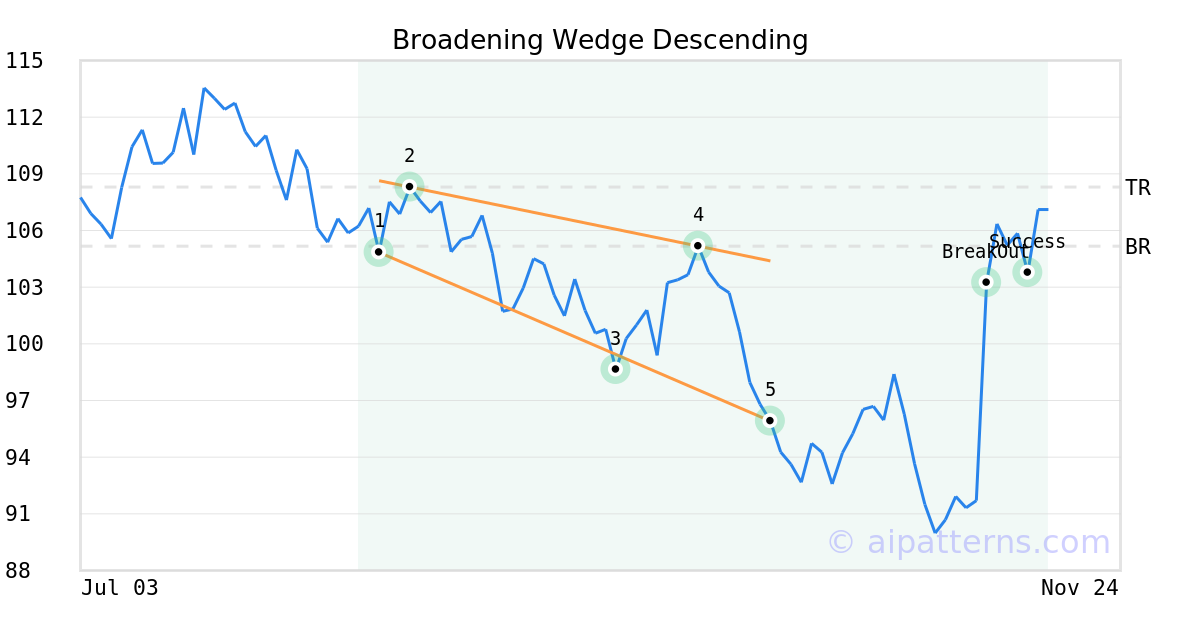 On October 08, 2025, A.I.dvisor detected a Broadening Wedge Descending Pattern (Bullish) for Planet Fitness (PLNT, $95.91). On November 06, 2025, A.I.dvisor confirmed the Bullish pattern, setting a target price of $108.30. 6 days later, on November 12, 2025, PLNT reached the target price resulting in a for traders who took a long position in the stock.