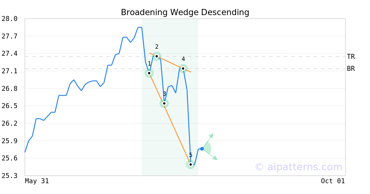 A.I.dvisor detected a bullish Broadening Wedge Descending pattern for PLSAX stock. This pattern was detected on August 05, 2024 . The odds of reaching the target price are 6. The Broadening Wedge Descending pattern forms when the price of a security makes lower lows (1, 3, 5) and lower highs (2, 4), forming a downtrend. Consider buying a security or call option at the upward breakout price level.