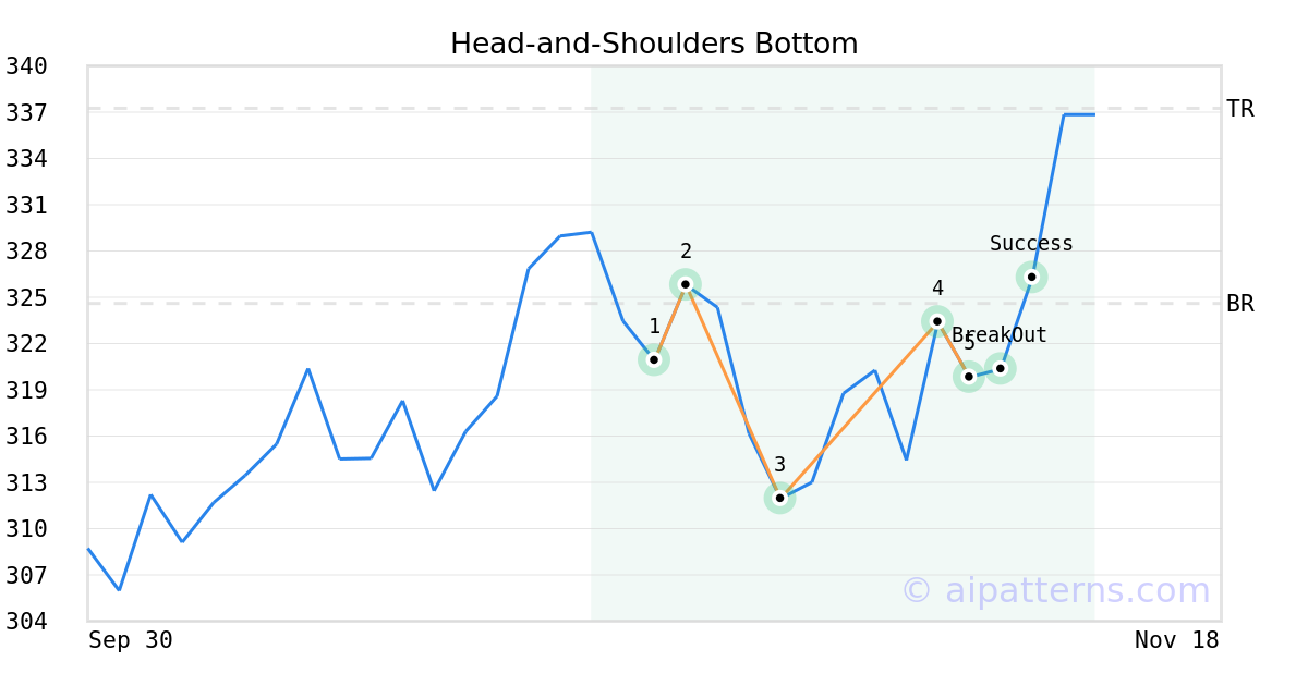 On November 07, 2025, A.I.dvisor detected a Head-and-Shoulders Bottom Pattern (Bullish) for Insulet Corp (PODD, $319.82). On November 10, 2025, A.I.dvisor confirmed the Bullish pattern, setting a target price of $337.25. 1 day later, on November 11, 2025, PODD reached the target price resulting in a for traders who took a long position in the stock.