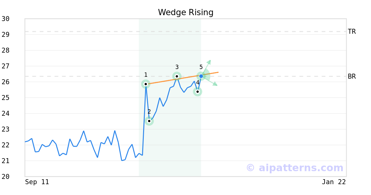 The Rising Wedge pattern forms when prices seem to be spiraling upward, and two upward sloping trend lines are created with the price hitting higher highs (1, 3, 5) and higher lows (2,4).