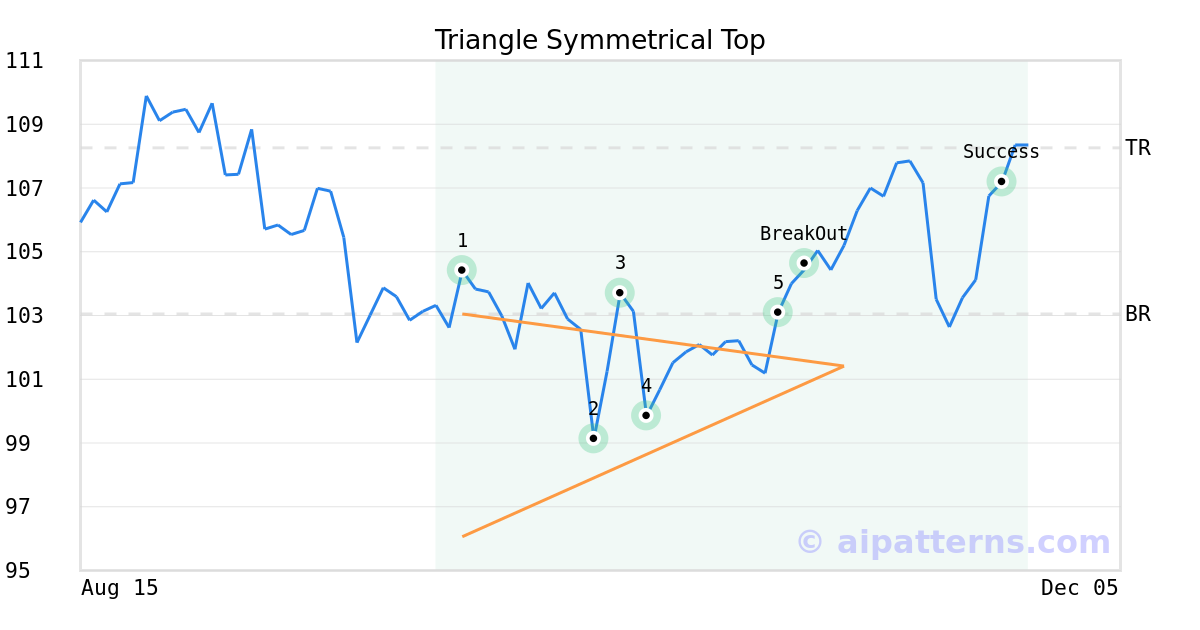 On October 30, 2025, A.I.dvisor detected a Triangle Symmetrical Top Pattern (Bullish) for Prudential Financial (PRU, $101.75). On November 03, 2025, A.I.dvisor confirmed the Bullish pattern, setting a target price of $108.26. 21 days later, on November 24, 2025, PRU reached the target price resulting in a for traders who took a long position in the stock.