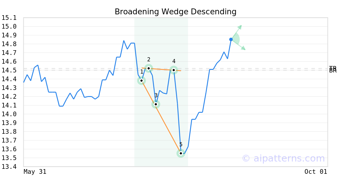 A.I.dvisor detected a bullish Broadening Wedge Descending pattern for PRWLX stock. This pattern was detected on August 05, 2024 . The odds of reaching the target price are 6. The Broadening Wedge Descending pattern forms when the price of a security makes lower lows (1, 3, 5) and lower highs (2, 4), forming a downtrend. Consider buying a security or call option at the upward breakout price level.