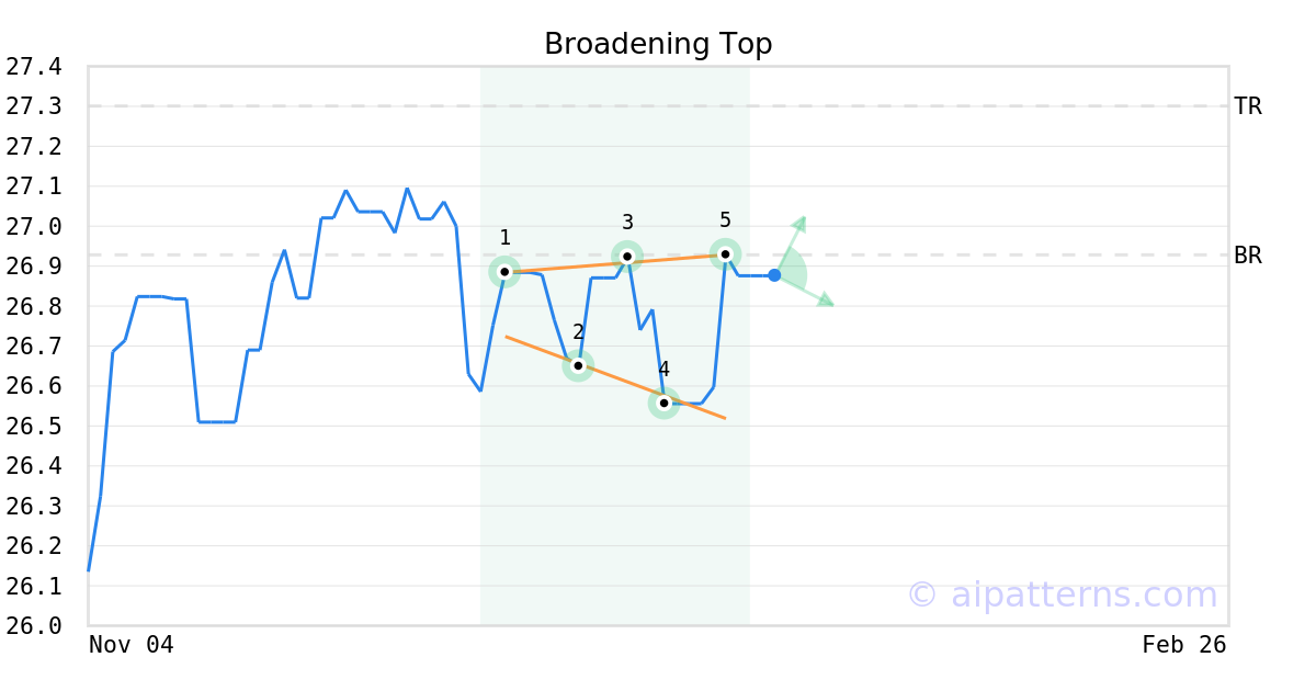 The Broadening Top pattern forms when the price of a security progressively makes higher highs (1, 3) and lower lows (2, 4) following two widening trend lines.