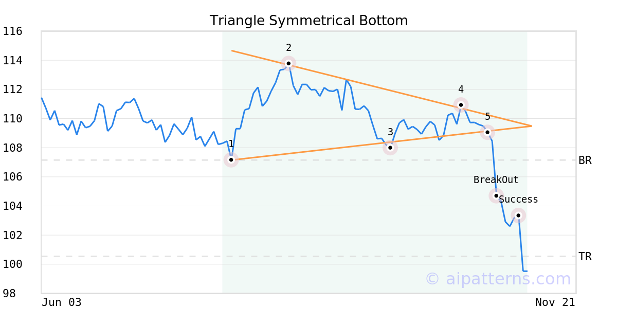 On October 27, 2025, A.I.dvisor detected a Triangle Symmetrical Bottom Pattern (Bearish) for Invesco DW Consumer Staples Momt ETF (PSL, $109.04). 2 days later, on October 29, 2025, A.I.dvisor confirmed the Bearish pattern, setting a target price of the stock. On November 05, 2025, the stock hit the target price of $100.54 – resulting in a gain for traders who shorted the stock on the pattern detection date.