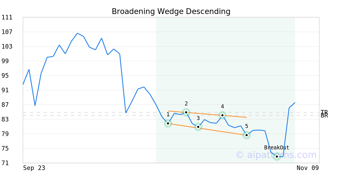 On October 30, 2025, A.I.dvisor detected a Broadening Wedge Descending Pattern (Bullish) for Quant cryptocurrency (QNT.X, $78.614760). On November 04, 2025, A.I.dvisor confirmed the Bullish pattern, setting a target price of $84.870000. On November 04, 2025, QNT.X reached the target price resulting in a for traders who took a long position in the stock.