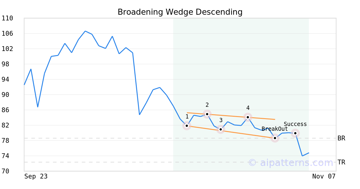 On October 30, 2025, A.I.dvisor detected a Broadening Wedge Descending Pattern (Bearish) for Quant cryptocurrency (QNT.X, $78.614760). On October 30, 2025, A.I.dvisor confirmed the Bearish pattern, setting a target price of the stock. On November 02, 2025, the stock hit the target price of $72.350000 – resulting in a gain for traders who shorted the stock on the pattern detection date.