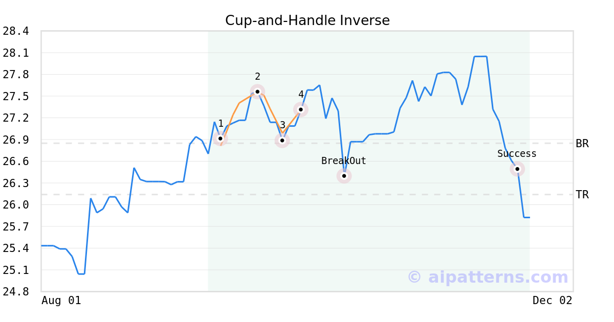 On October 01, 2025, A.I.dvisor detected a Cup-and-Handle Inverse Pattern (Bearish) for Invesco ESG NASDAQ Next Gen 100 ETF (QQJG, $27.31). 9 days later, on October 10, 2025, A.I.dvisor confirmed the Bearish pattern, setting a target price of the stock. On November 19, 2025, the stock hit the target price of $26.14 – resulting in a gain for traders who shorted the stock on the pattern detection date.