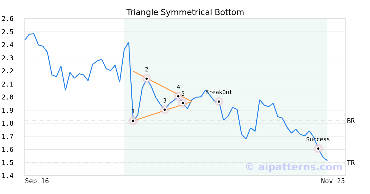 On October 21, 2025, A.I.dvisor detected a Triangle Symmetrical Bottom Pattern (Bearish) for Qtum cryptocurrency (QTUM.X, $1.959093). 8 days later, on October 29, 2025, A.I.dvisor confirmed the Bearish pattern, setting a target price of the stock. On November 20, 2025, the stock hit the target price of $1.498000 – resulting in a +1 gain for traders who shorted the stock on the pattern detection date.