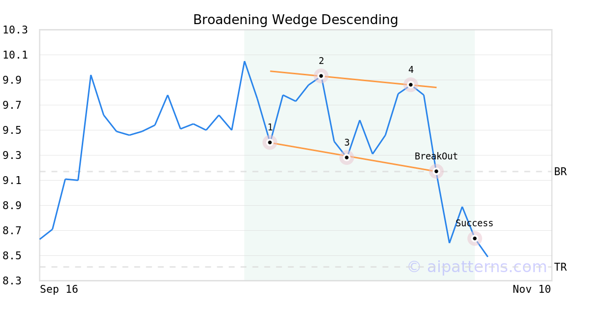 On October 29, 2025, A.I.dvisor detected a Broadening Wedge Descending Pattern (Bearish) for FreightCar America (RAIL, $9.17). On October 29, 2025, A.I.dvisor confirmed the Bearish pattern, setting a target price of the stock. On November 03, 2025, the stock hit the target price of $8.41 – resulting in a gain for traders who shorted the stock on the pattern detection date.