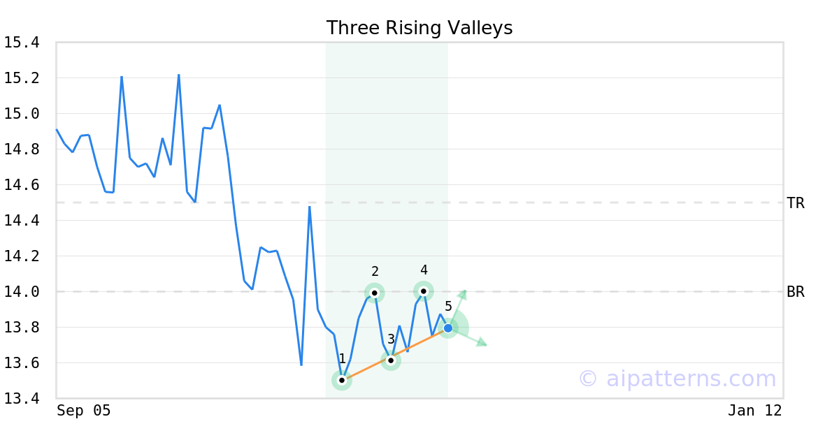 The Three Rising Valleys pattern forms when three minor Lows (1, 3, 5) are arranged along an upward sloping trend line.