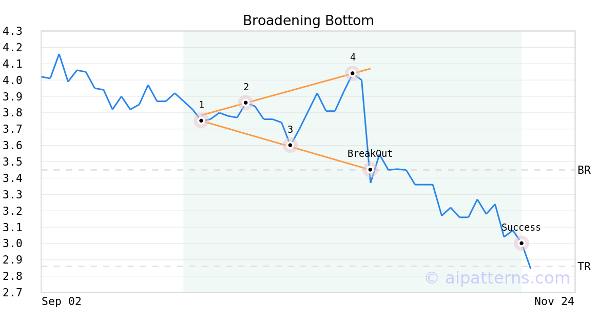 On October 23, 2025, A.I.dvisor detected a Broadening Bottom Pattern (Bearish) for Ribbon Communications (RBBN, $3.45). On October 23, 2025, A.I.dvisor confirmed the Bearish pattern, setting a target price of the stock. On November 17, 2025, the stock hit the target price of $2.86 – resulting in a +1 gain for traders who shorted the stock on the pattern detection date.