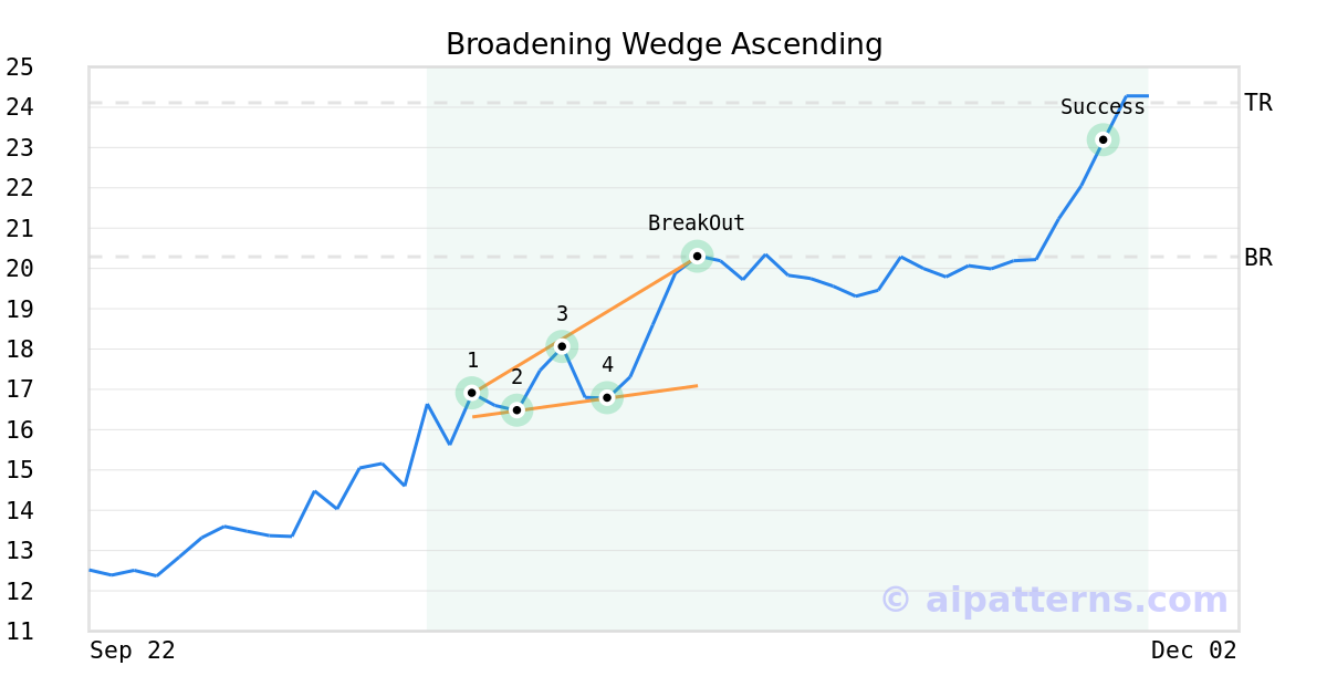 On October 29, 2025, A.I.dvisor detected a Broadening Wedge Ascending Pattern (Bullish) for Arcus Biosciences (RCUS, $20.29). On October 29, 2025, A.I.dvisor confirmed the Bullish pattern, setting a target price of $24.11. 26 days later, on November 24, 2025, RCUS reached the target price resulting in a +1 for traders who took a long position in the stock.