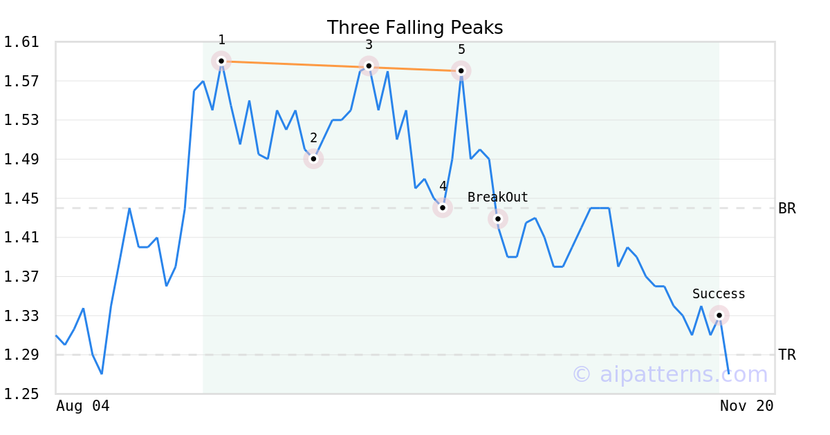 On October 06, 2025, A.I.dvisor detected a Three Falling Peaks Pattern (Bearish) for Reading International (RDI, $1.58). 4 days later, on October 10, 2025, A.I.dvisor confirmed the Bearish pattern, setting a target price of the stock. On November 13, 2025, the stock hit the target price of $1.29 – resulting in a +1 gain for traders who shorted the stock on the pattern detection date.
