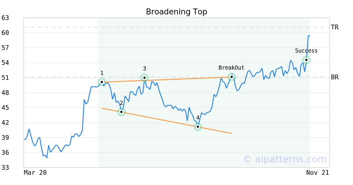 On September 08, 2025, A.I.dvisor detected a Broadening Top Pattern (Bullish) for Red Violet (RDVT, $51.13). On September 08, 2025, A.I.dvisor confirmed the Bullish pattern, setting a target price of $61.12. 58 days later, on November 05, 2025, RDVT reached the target price resulting in a for traders who took a long position in the stock.