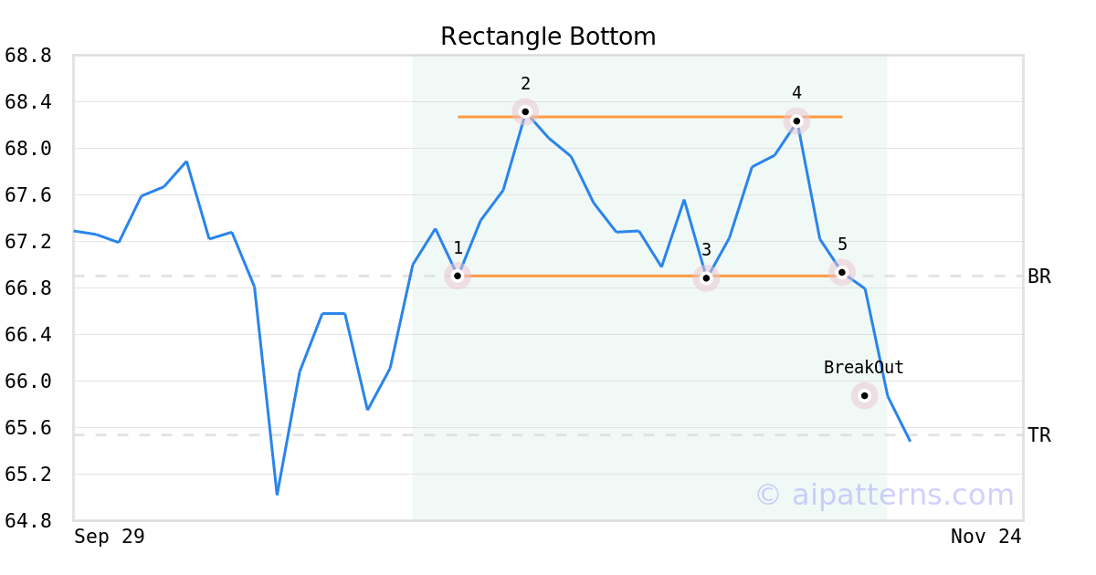 On November 14, 2025, A.I.dvisor detected a Rectangle Bottom Pattern (Bearish) for First Trust Rising Dividend Achiev ETF (RDVY, $66.93). 3 days later, on November 17, 2025, A.I.dvisor confirmed the Bearish pattern, setting a target price of the stock. On November 17, 2025, the stock hit the target price of $65.54 – resulting in a gain for traders who shorted the stock on the pattern detection date.