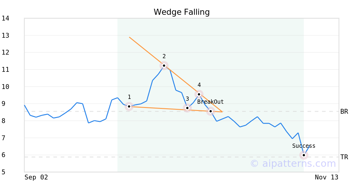 On October 16, 2025, A.I.dvisor detected a Wedge Falling Pattern (Bearish) for Redwire Corp (RDW, $8.55). On October 16, 2025, A.I.dvisor confirmed the Bearish pattern, setting a target price of the stock. On November 06, 2025, the stock hit the target price of $5.88 – resulting in a +3 gain for traders who shorted the stock on the pattern detection date.