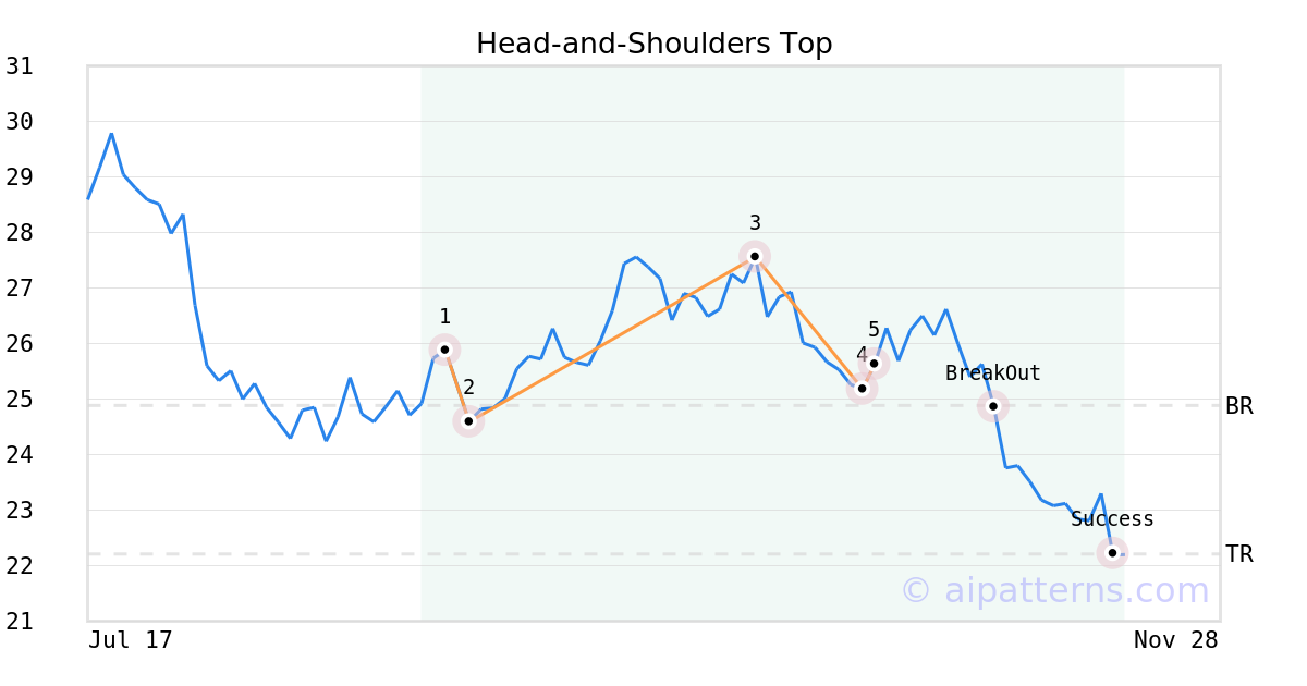 On October 20, 2025, A.I.dvisor detected a Head-and-Shoulders Top Pattern (Bearish) for Radware Ltd (RDWR, $25.63). 14 days later, on November 03, 2025, A.I.dvisor confirmed the Bearish pattern, setting a target price of the stock. On November 17, 2025, the stock hit the target price of $22.21 – resulting in a +1 gain for traders who shorted the stock on the pattern detection date.