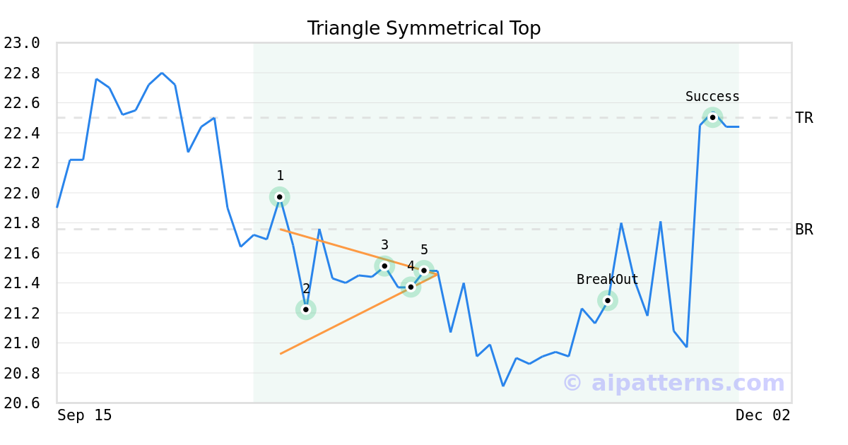 On October 23, 2025, A.I.dvisor detected a Triangle Symmetrical Top Pattern (Bullish) for RGC Resources (RGCO, $21.48). On November 12, 2025, A.I.dvisor confirmed the Bullish pattern, setting a target price of $22.50. 12 days later, on November 24, 2025, RGCO reached the target price resulting in a for traders who took a long position in the stock.
