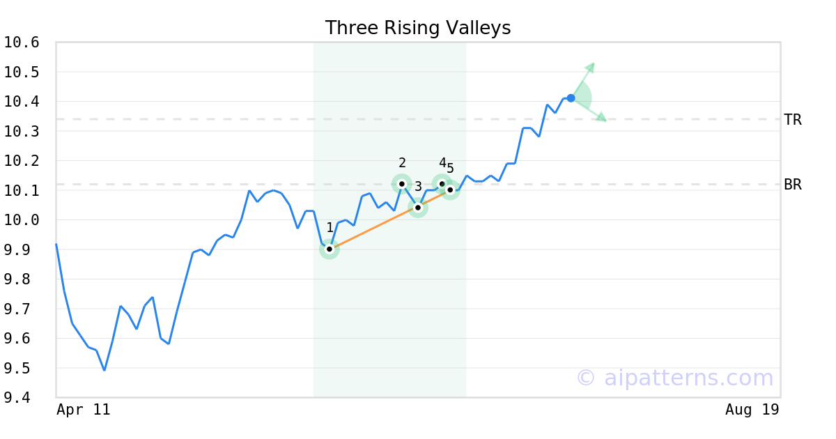 A.I.dvisor detected a bullish Three Rising Valleys pattern for RGEAX stock. This pattern was detected on June 21, 2024 . The odds of reaching the target price are 6. The Three Rising Valleys pattern forms when three minor Lows (1, 3, 5) are arranged along an upward sloping trend line. Consider buying a security or call option at the breakout price level. When trading, wait for the confirmation move, which is when the price rises above the breakout level.