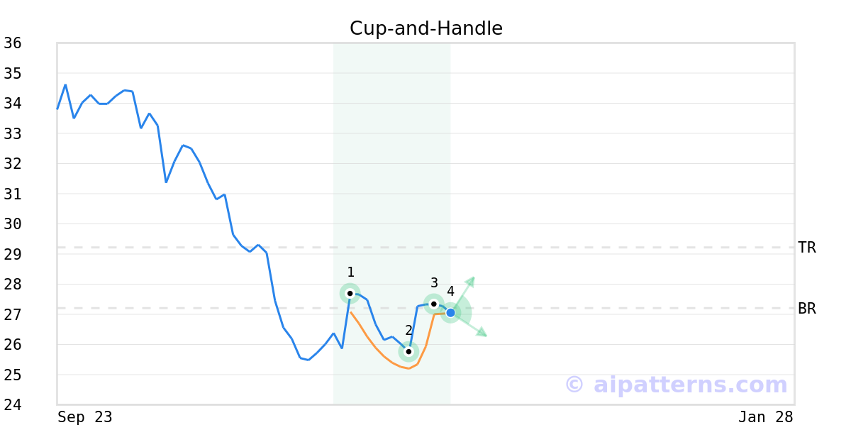 A.I.dvisor detected a bullish Cup-and-Handle pattern for RHI stock. This pattern was detected on November 28, 2025 . The odds of reaching the target price are 6.