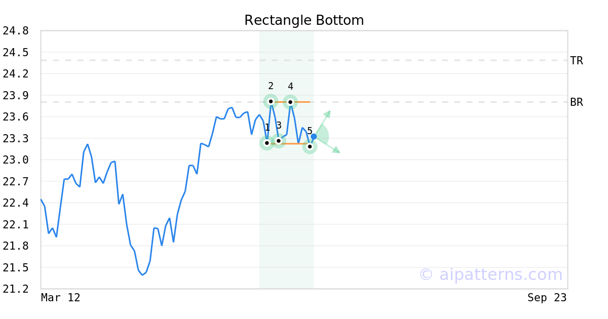A.I.dvisor detected a bullish Rectangle Bottom pattern for RHJSX stock. This pattern was detected on June 20, 2024 . The odds of reaching the target price are 6. Two horizontal lines (1, 3, 5) and (2, 4) form the Rectangle Bottom Pattern as the security bounces up and down between support and resistance levels. Consider buying a security or call option at the breakout price level. When trading, wait for the confirmation move, which is when the price rises above the breakout level.