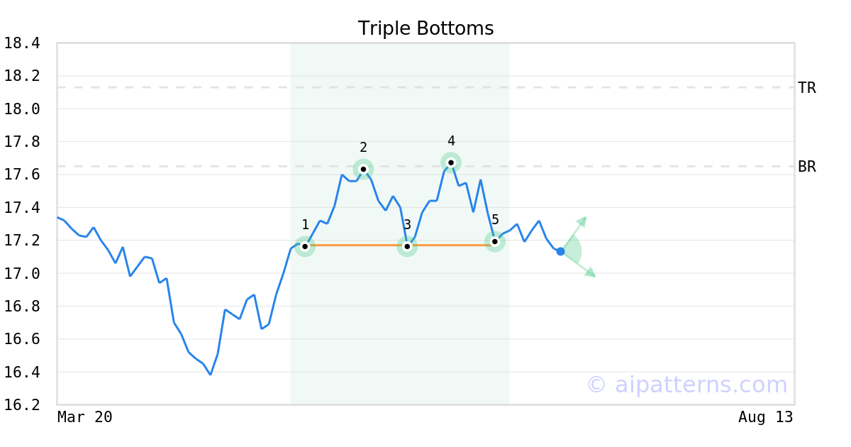 A.I.dvisor detected a bullish Triple Bottoms pattern for RIVKX stock. This pattern was detected on June 14, 2024 . The odds of reaching the target price are 6. The Triple Bottom pattern appears when there are three distinct low points (1, 3, 5) that represent a consistent support level. Consider buying a security or call option at the breakout price level. When trading, wait for the confirmation move, which is when the price rises above the breakout level.