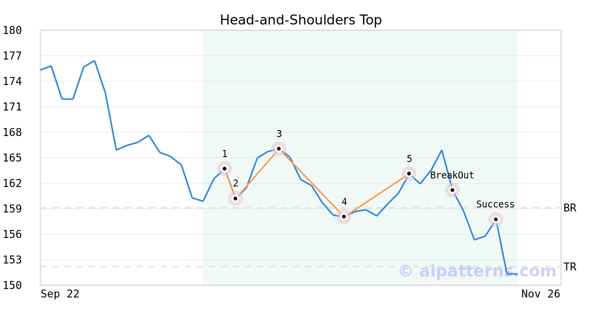 On November 07, 2025, A.I.dvisor detected a Head-and-Shoulders Top Pattern (Bearish) for Raymond James Financial (RJF, $163.11). 6 days later, on November 13, 2025, A.I.dvisor confirmed the Bearish pattern, setting a target price of the stock. On November 19, 2025, the stock hit the target price of $152.19 – resulting in a gain for traders who shorted the stock on the pattern detection date.