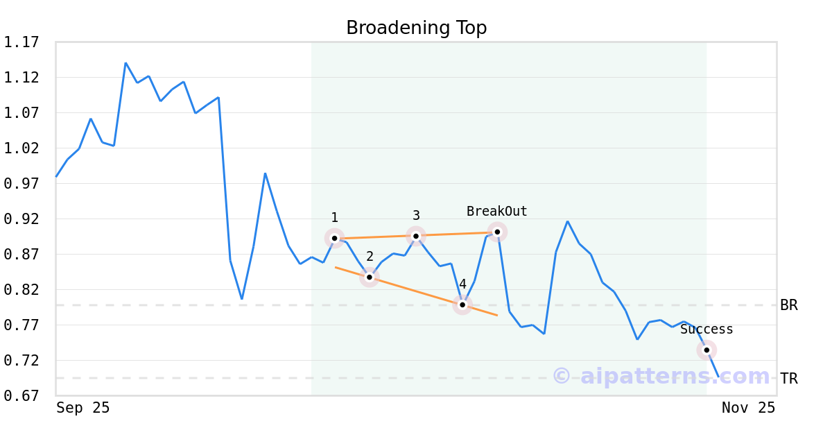 On November 02, 2025, A.I.dvisor detected a Broadening Top Pattern (Bearish) for iExec RLC cryptocurrency (RLC.X, $0.902781). On November 02, 2025, A.I.dvisor confirmed the Bearish pattern, setting a target price of the stock. On November 20, 2025, the stock hit the target price of $0.695000 – resulting in a +1 gain for traders who shorted the stock on the pattern detection date.