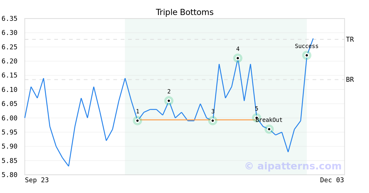 On November 13, 2025, A.I.dvisor detected a Triple Bottoms Pattern (Bullish) for Radiant Logistics (RLGT, $6.00). On November 17, 2025, A.I.dvisor confirmed the Bullish pattern, setting a target price of $6.28. 8 days later, on November 25, 2025, RLGT reached the target price resulting in a for traders who took a long position in the stock.