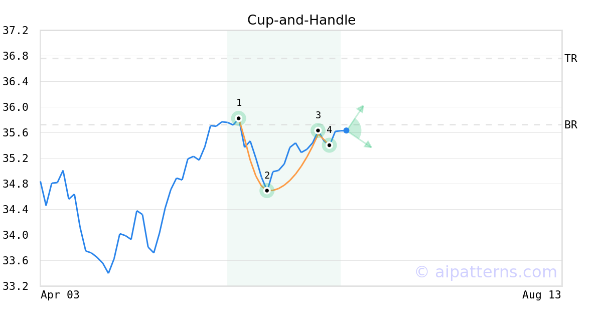 A.I.dvisor detected a bullish Cup-and-Handle pattern for RMBGX stock. This pattern was detected on June 14, 2024 . The odds of reaching the target price are 6. The Cup-and-Handle (sometimes called Cup-and-Holder) pattern is formed when the price of a security initially declines and then rises to form a “U”-like rounded shape (1, 2, 3, also known as the Cup). Once it forms the right lip, it is characterized by short, relatively straight price decline (from 3 to 4) forming the handle. Consider buying a security or call option at the upward breakout price/entry point. The confirmation move is when the security moves past the breakout price above the right cup lip.