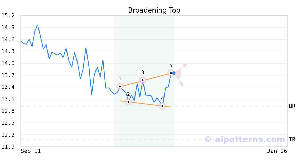 The Broadening Top pattern forms when a security price makes higher highs (1, 3, 5) and lower lows (2, 4) following two widening trend lines.