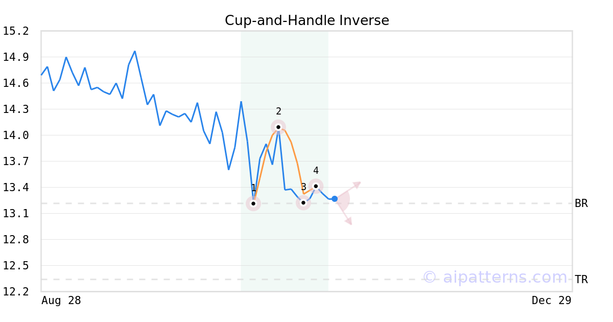 The Inverted Cup-and-Handle (sometimes called Inverted Cup-and-Holder) pattern forms when prices rise then decline to create an upside-down “U”like shape (1, 2, 3, also known as the Cup), followed by a shorter relatively straight price increase that bounces from the right lip (from 3 to 4, creating the Handle).