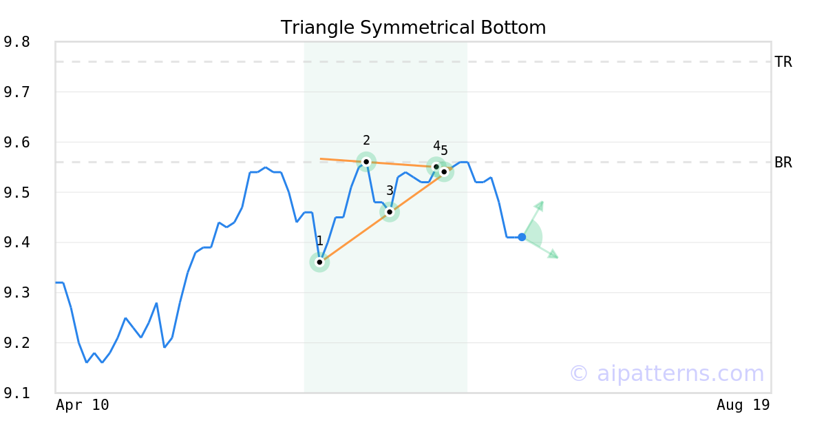 The Symmetrical Triangle Bottom pattern forms when the price of a security fails to retest a high or a low and ultimately forms two narrowing trend lines. As the support and resistance levels consolidate, they form a triangle.