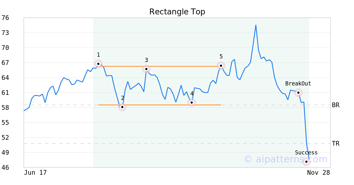 On October 02, 2025, A.I.dvisor detected a Rectangle Top Pattern (Bearish) for Gibraltar Industries (ROCK, $66.37). 41 days later, on November 12, 2025, A.I.dvisor confirmed the Bearish pattern, setting a target price of the stock. On November 17, 2025, the stock hit the target price of $50.81 – resulting in a +2 gain for traders who shorted the stock on the pattern detection date.
