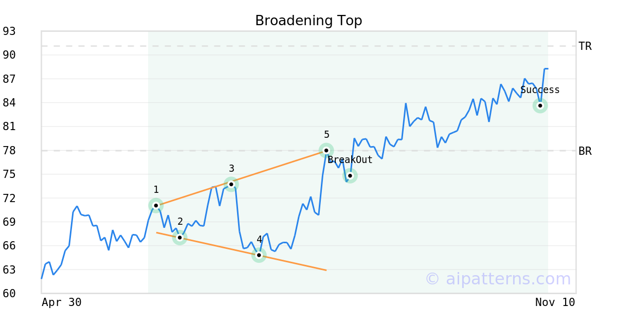 On August 13, 2025, A.I.dvisor detected a Broadening Top Pattern (Bullish) for Rogers Corp (ROG, $77.95). On August 21, 2025, A.I.dvisor confirmed the Bullish pattern, setting a target price of $91.12. 69 days later, on October 29, 2025, ROG reached the target price resulting in a for traders who took a long position in the stock.