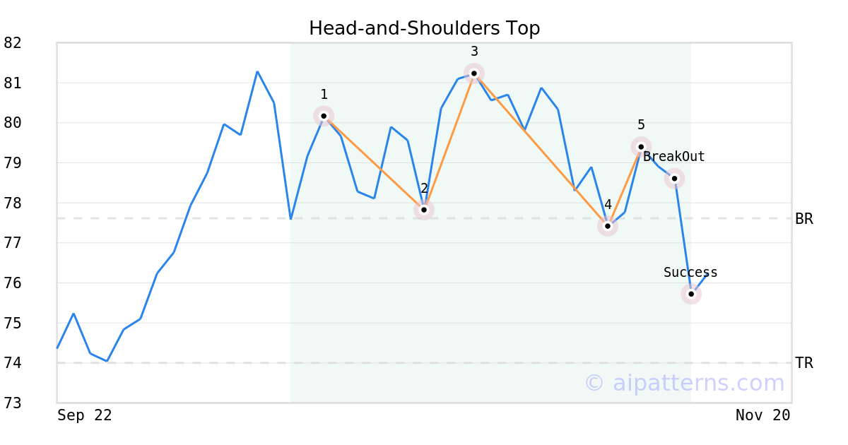On November 10, 2025, A.I.dvisor detected a Head-and-Shoulders Top Pattern (Bearish) for Stt Strt® SPDR® S&PKenshoFnlFrntrsETF (ROKT, $79.39). 2 days later, on November 12, 2025, A.I.dvisor confirmed the Bearish pattern, setting a target price of the stock. On November 13, 2025, the stock hit the target price of $74.00 – resulting in a gain for traders who shorted the stock on the pattern detection date.