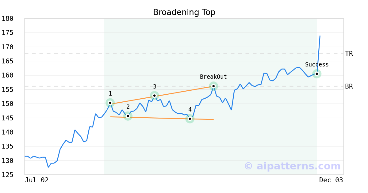 On October 02, 2025, A.I.dvisor detected a Broadening Top Pattern (Bullish) for Ross Stores (ROST, $156.17). On October 02, 2025, A.I.dvisor confirmed the Bullish pattern, setting a target price of $167.67. 49 days later, on November 20, 2025, ROST reached the target price resulting in a for traders who took a long position in the stock.