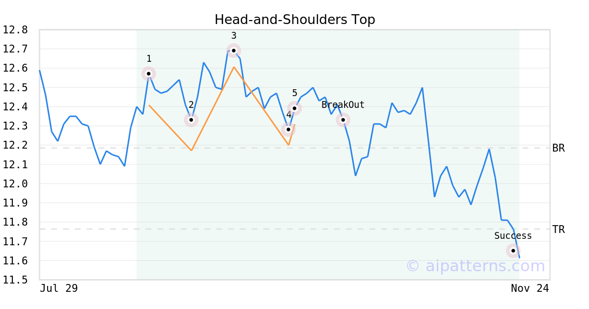 On September 26, 2025, A.I.dvisor detected a Head-and-Shoulders Top Pattern (Bearish) for COHEN & STEERS QUALITY Income REALTY FUND (RQI, $12.23). 12 days later, on October 08, 2025, A.I.dvisor confirmed the Bearish pattern, setting a target price of the stock. On November 17, 2025, the stock hit the target price of $11.76 – resulting in a gain for traders who shorted the stock on the pattern detection date.