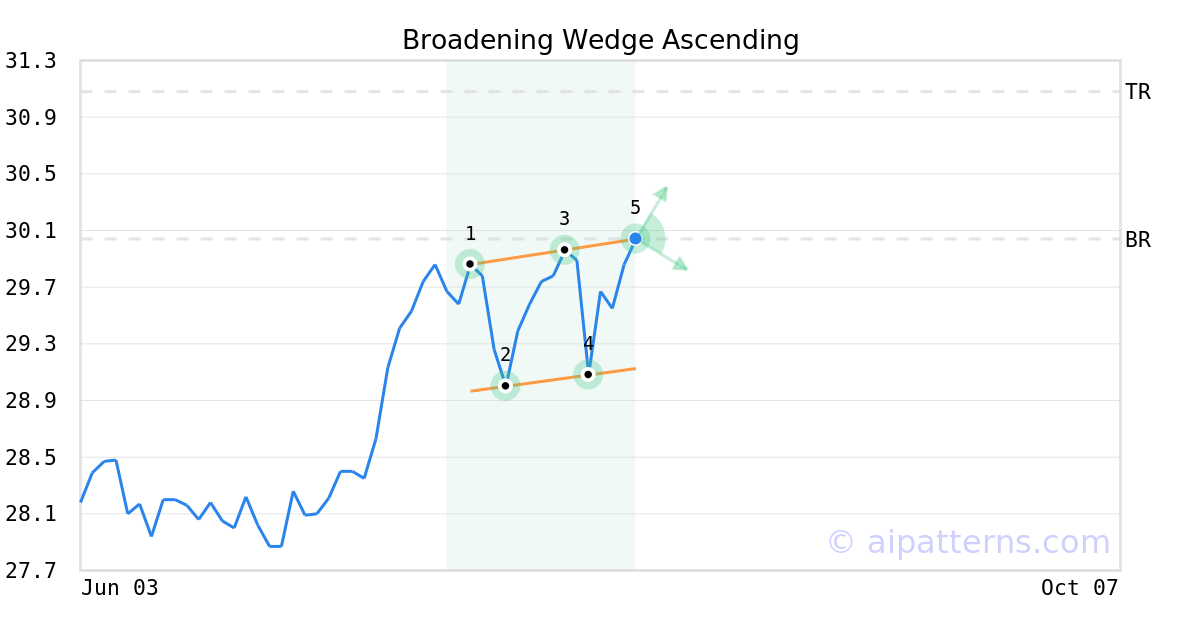 The Broadening Wedge Ascending pattern forms when the price of a security progressively makes higher highs (1, 3) and higher lows (2, 4), following two widening trend lines.