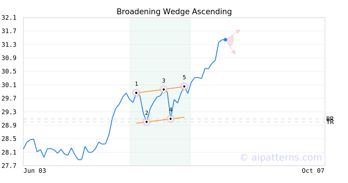 A.I.dvisor detected a bearish Broadening Wedge Ascending pattern for RREYX stock. This pattern was detected on August 09, 2024 . The odds of reaching the target price are . The Broadening Wedge Ascending pattern forms when a security price progressively makes higher highs (1, 3, 5) and higher lows (2, 4), following two widening trend lines. Consider selling the security short or buying a put option at the downward breakout price level, which is the last low that touches the bottom line (4).