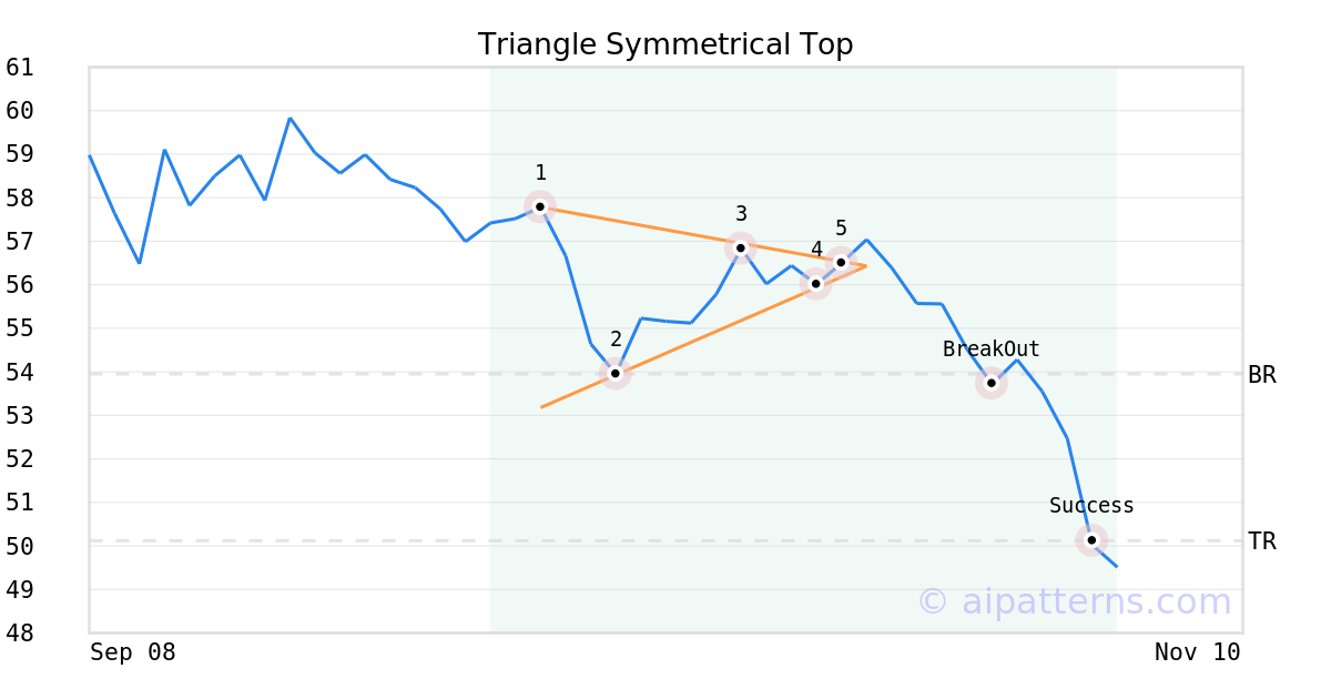 On October 20, 2025, A.I.dvisor detected a Triangle Symmetrical Top Pattern (Bearish) for Rush Enterprises (RUSHB, $56.50). 8 days later, on October 28, 2025, A.I.dvisor confirmed the Bearish pattern, setting a target price of the stock. On November 03, 2025, the stock hit the target price of $50.12 – resulting in a +1 gain for traders who shorted the stock on the pattern detection date.