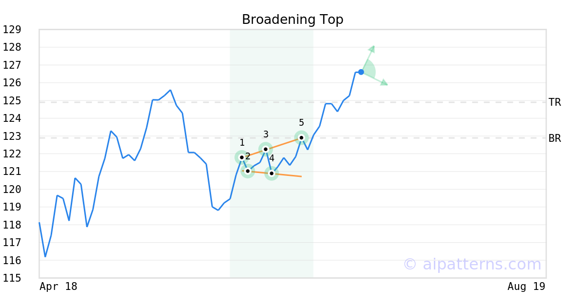 A.I.dvisor detected a bullish Broadening Top pattern for RYIIX stock. This pattern was detected on June 21, 2024 . The odds of reaching the target price are 7. The Broadening Top pattern forms when the price of a security progressively makes higher highs (1, 3) and lower lows (2, 4) following two widening trend lines. Consider buying a security or call option at the upward breakout price/entry point.