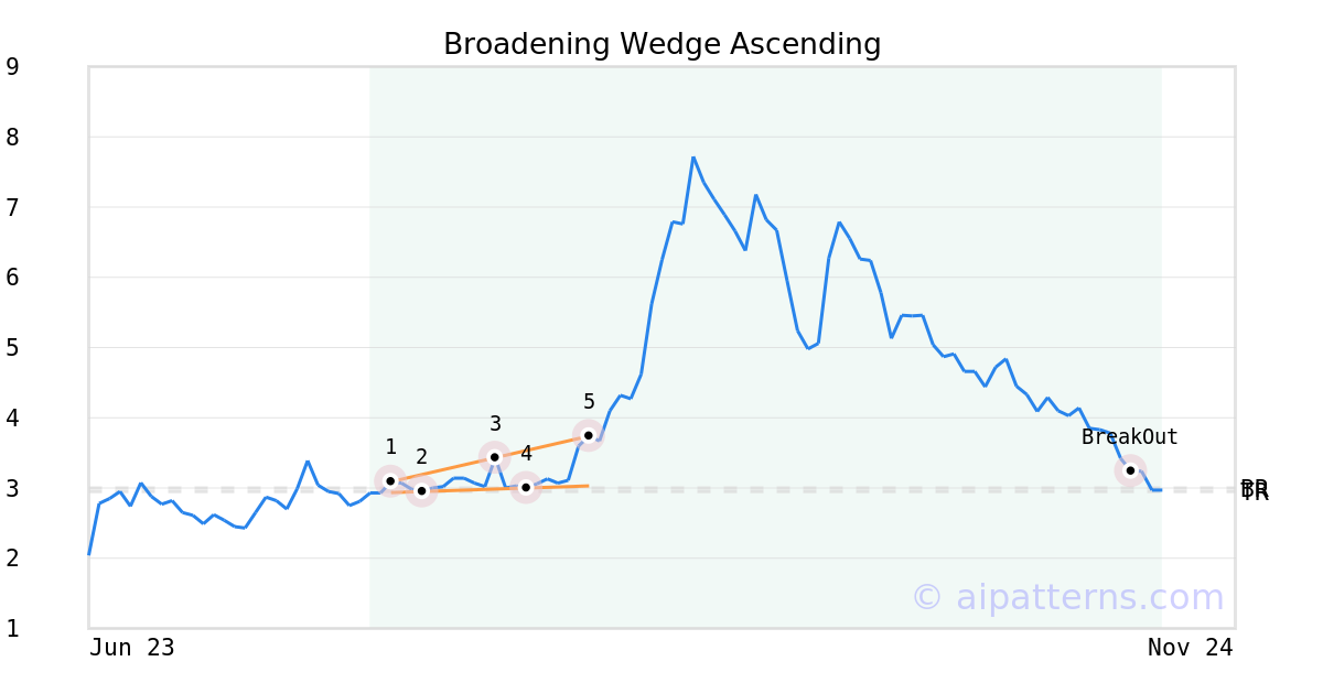 On August 29, 2025, A.I.dvisor detected a Broadening Wedge Ascending Pattern (Bearish) for Rezolve AI PLC (RZLV, $3.74). 75 days later, on November 12, 2025, A.I.dvisor confirmed the Bearish pattern, setting a target price of the stock. On November 12, 2025, the stock hit the target price of $2.95 – resulting in a +1 gain for traders who shorted the stock on the pattern detection date.