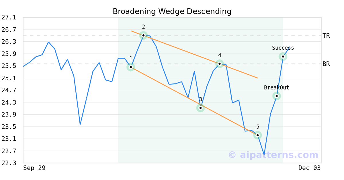 On November 19, 2025, A.I.dvisor detected a Broadening Wedge Descending Pattern (Bullish) for ProShares Ultra SmallCap600 (SAA, $23.21). On November 24, 2025, A.I.dvisor confirmed the Bullish pattern, setting a target price of $26.50. 1 day later, on November 25, 2025, SAA reached the target price resulting in a +1 for traders who took a long position in the stock.