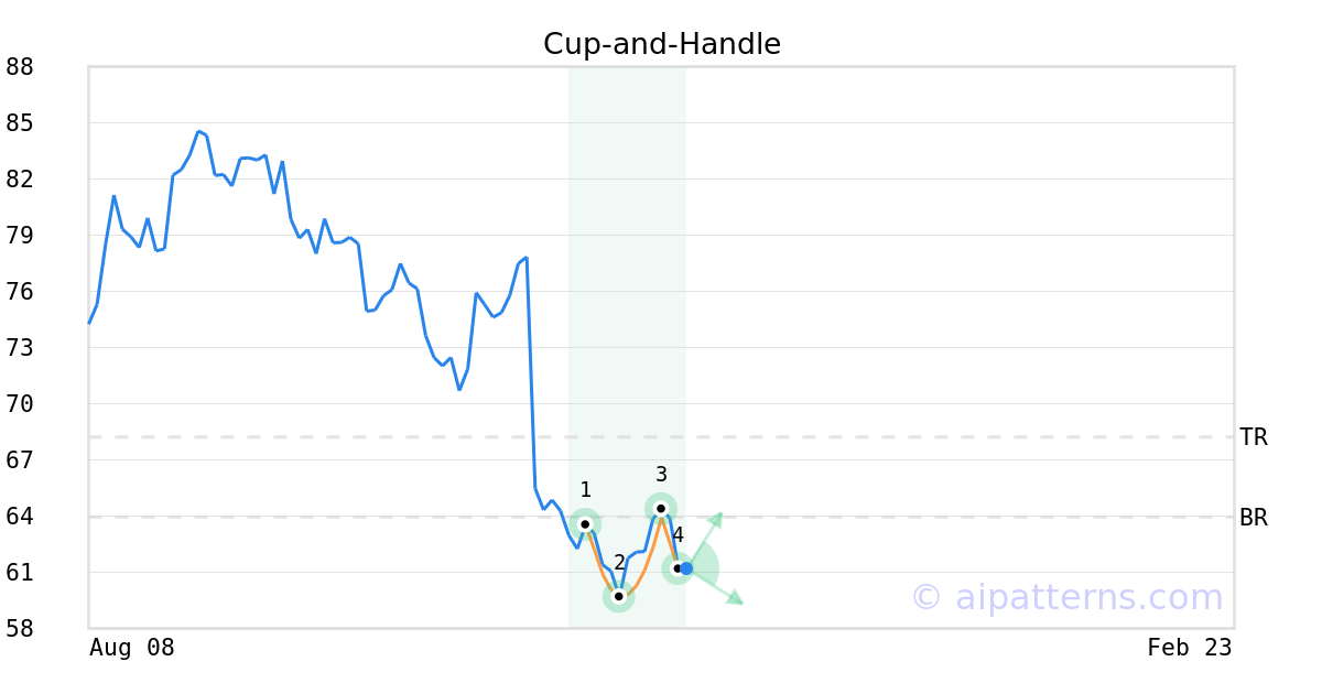 The Cup-and-Handle (sometimes called Cup-and-Holder) pattern is formed when the price of a security initially declines and then rises to form a “U”-like rounded shape (1, 2, 3, also known as the Cup). Once it forms the right lip, it is characterized by short, relatively straight price decline (from 3 to 4) forming the handle.