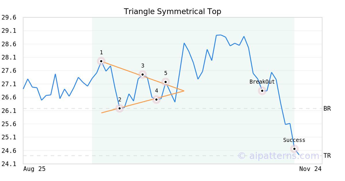 On October 08, 2025, A.I.dvisor detected a Triangle Symmetrical Top Pattern (Bearish) for StandardAero Inc (SARO, $27.17). 29 days later, on November 06, 2025, A.I.dvisor confirmed the Bearish pattern, setting a target price of the stock. On November 17, 2025, the stock hit the target price of $24.41 – resulting in a gain for traders who shorted the stock on the pattern detection date.