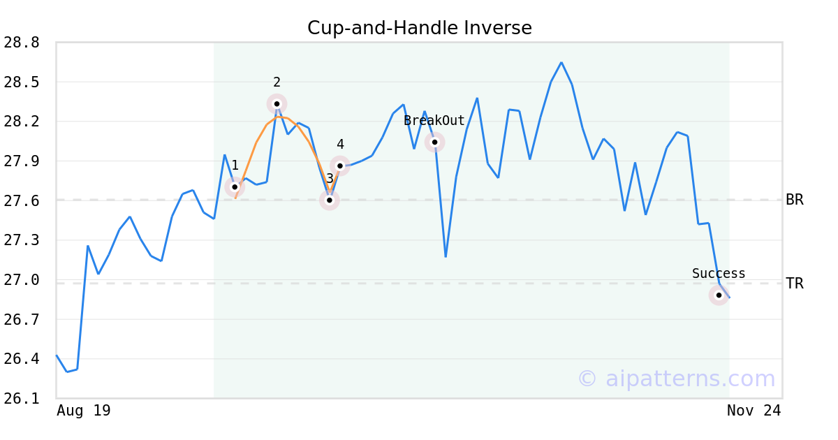 On September 26, 2025, A.I.dvisor detected a Cup-and-Handle Inverse Pattern (Bearish) for Schwab US Small-Cap ETF™ (SCHA, $27.86). 13 days later, on October 09, 2025, A.I.dvisor confirmed the Bearish pattern, setting a target price of the stock. On November 17, 2025, the stock hit the target price of $26.97 – resulting in a gain for traders who shorted the stock on the pattern detection date.