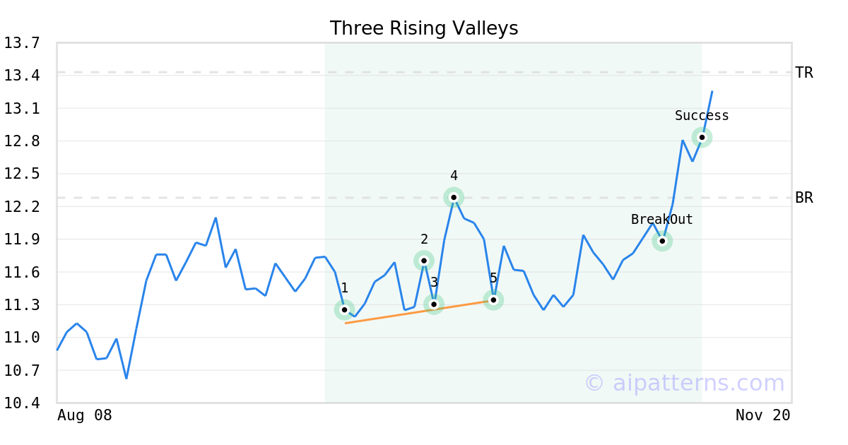 On October 10, 2025, A.I.dvisor detected a Three Rising Valleys Pattern (Bullish) for SandRidge Energy (SD, $11.34). On November 04, 2025, A.I.dvisor confirmed the Bullish pattern, setting a target price of $13.43. 6 days later, on November 10, 2025, SD reached the target price resulting in a +1 for traders who took a long position in the stock.