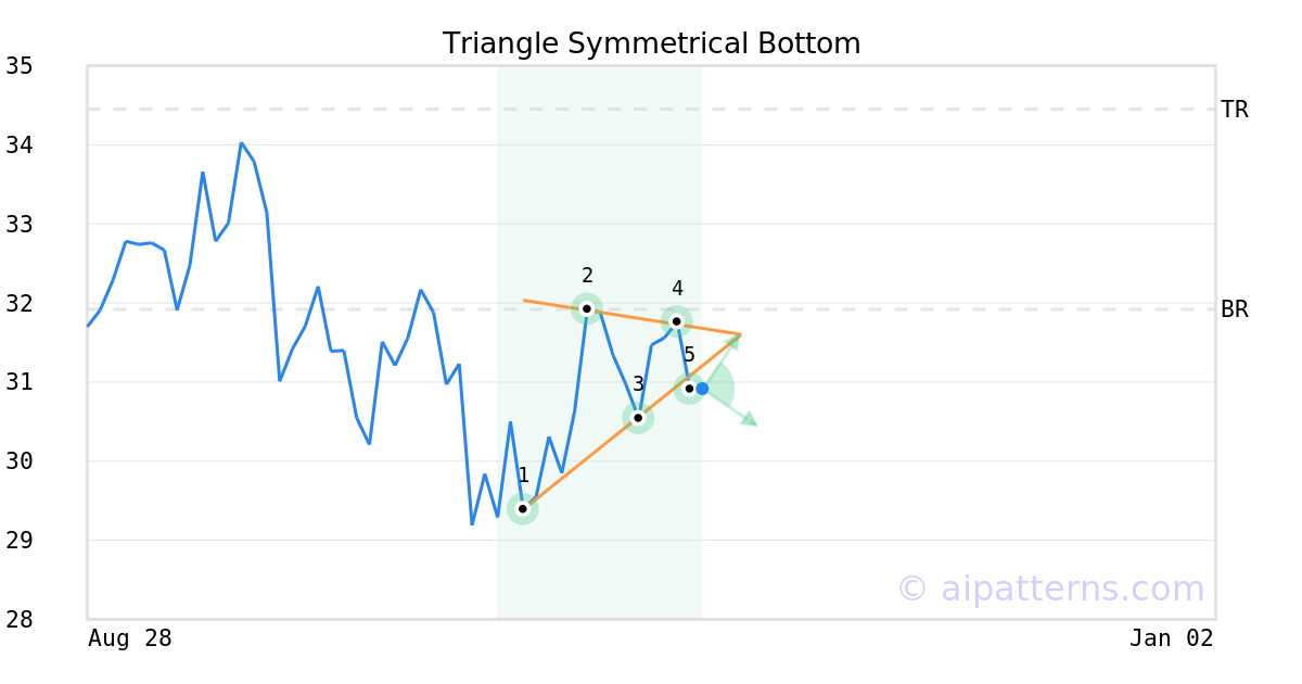 The Symmetrical Triangle Bottom pattern forms when the price of a security fails to retest a high or a low and ultimately forms two narrowing trend lines. As the support and resistance levels consolidate, they form a triangle.